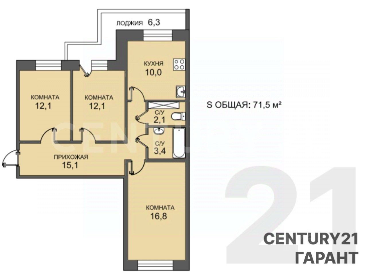 Просторная кухня (10 кв. м) — идеальное место для кулинарных экспериментов и семейных ужинов. Три светлые и уютные комнаты (12,1 + 12,1 + 16,8 кв. м), где каждый найдёт своё пространство для отдыха и творчества. Вместительный коридор (15 кв. м), который станет центром хранения и удобства. Большая застеклённая лоджия (6,3 кв. м) с удобными шкафами, где можно наслаждаться утренним кофе и видом на город.