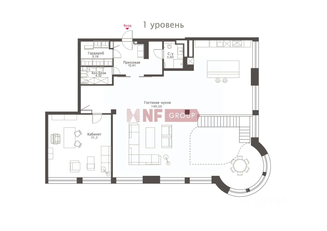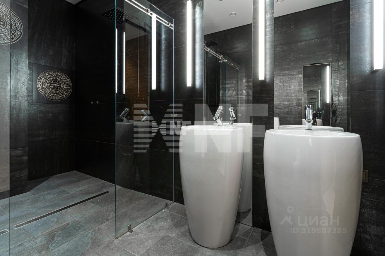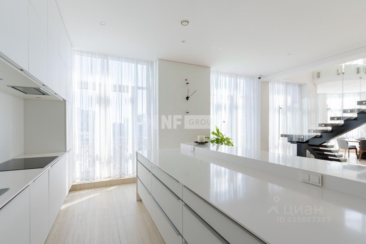 Организация пространства удобна и эргономична. Большие объемы и правильная форма. Огромная гостиная 140 кв.м с зоной кухни, эркер. Высота потолков гостиной до 10 м. Акцент украшения гостиной - картины, написанные персонально для заказчика квартиры. Уединенный кабинет в два окна (возможная четвёртая спальня). Второй уровень традиционно 3 спальни, из мастер-спальни вход в собственный санузел с душевой. Санузел с душевой для детских. Максимум свободного пространства сохраняют продуманные зоны хранения. Большие гардеробные на обоих уровнях, постирочная с бытовой техникой премиум-класса, хозяйственная комната, гостевой санузел.