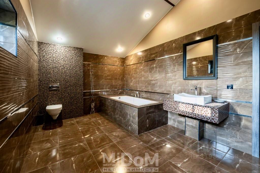На первом этаже при входе расположена вместительная гардеробная. В кухне-гостиной площадью 50 кв.м. есть место для большой компании или спокойного ужина всей семьёй. Прямо из гостиной- выход на просторную террасу с видом на сад. Шикарная итальянская кухня фирмы Arrex с индукционной плитой, отдельным духовым шкафом, микроволновой печью (все фирмы Bosh) посудомоечной машиной и огромным холодильником обеспечит Вам удовольствие от приготовления еды. В уютной библиотеке можно отдохнуть или поработать в тишине. Электрическая сауна из африканского дерева апаш подарит Вам расслабление и здоровье. В двух санузлах первого этажа установлена сантехника немецкой фирмы Villeroy & Boch.