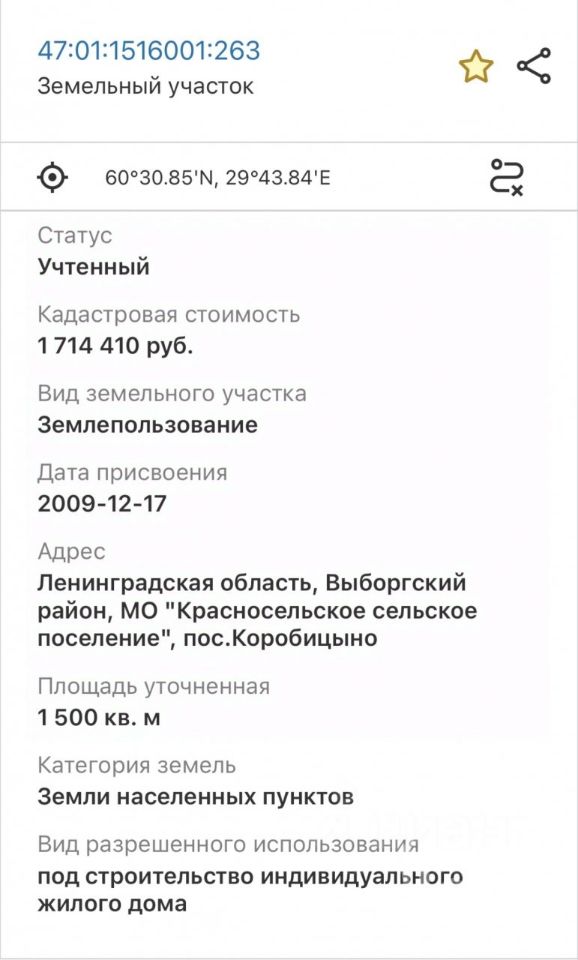 339557 Продается земельный участок в п.Коробицыно 15 соток ИЖС ( аренда 49 лет с правом выкупа 3% от кадастровой стоимости ). Аренда от 16.06.2010г. Участок угловой, правильной формы, сухой, ровный .Эл-во 15 квт, подключен центральный водопровод. Категория земли - населенных пунктов, разрешенное использование- под строительство индивидуального жилого дома. Кадастровый номер:47:01:1516001:263. До горнолыжных курортов 5 минут на машине 'Красное озеро' Золотая Долина 'Снежный. До центра поселка 10 минут пешком где есть сетевые магазины, кафе, школа, дет.сад , автобусная остановка и т.д. Отличное вложение денег для дальнейшего строительства домика под сдачу в аренду или для постоянного проживания. Участок можно разделить на два. Один взрослый собственник. Ждем Вас на просмотры. Участок расположен в пешей доступности 10 минут до центра поселка где есть сетевые магазины, аптека и автобусная остановка и т.д. До горнолыжных курортов 3 км.