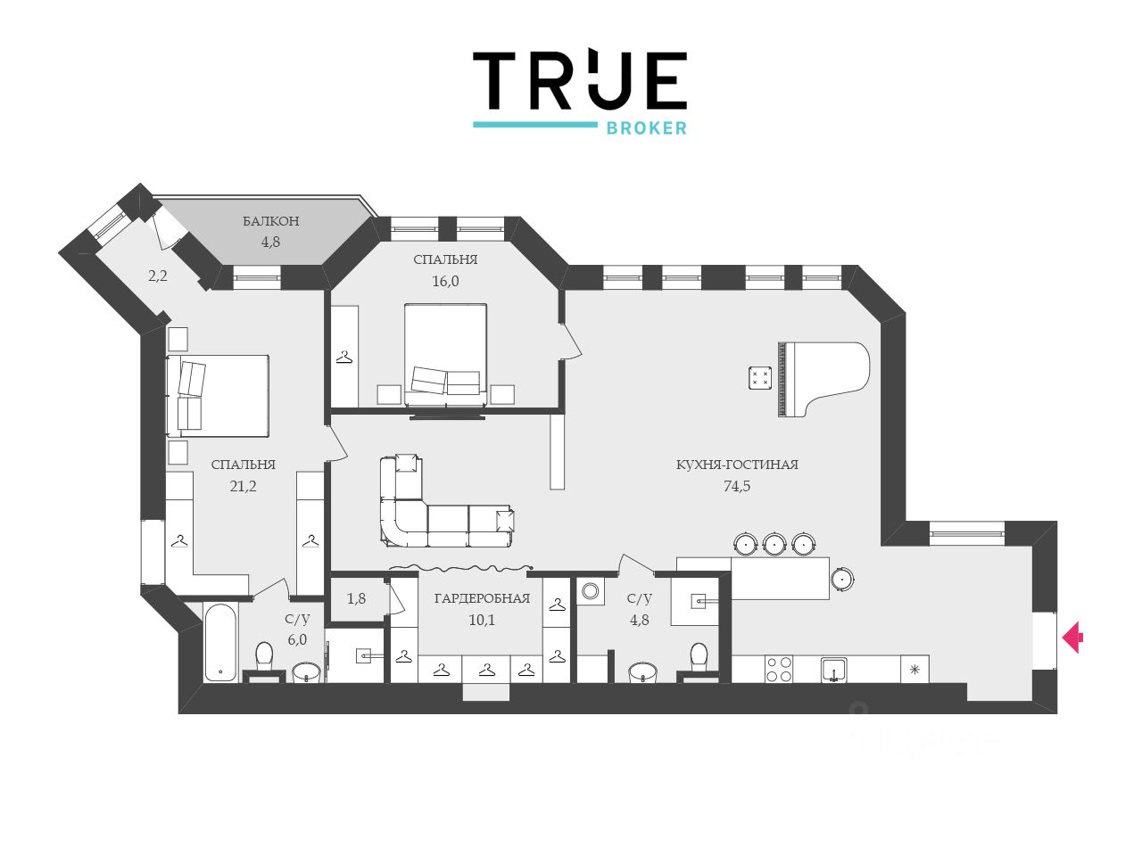 Квaртира современной планировки: две комфортных спальни, одна из которых - мастер-спальня - с собственным санузлом и гардеробной. Просторная кухня-гостиная 75 квадратных метров, позволяет реализовать любое интерьерное решение для комфортного отдыха и проведения семейных ужинов. В квартире две гардеробные, один большой балкон и две полноценные уборные, что обеспечивает дополнительное удобство. Отдельное пространстрво с TV для просмотра кино или подключения ноутбука для работы.