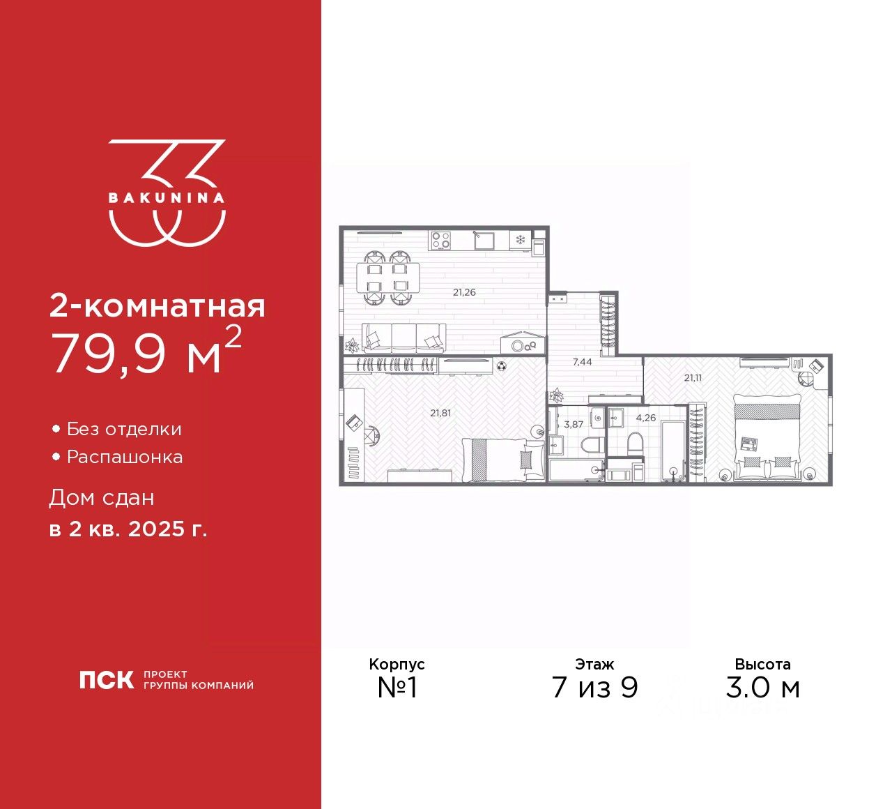 Двухкомнатная квартира от застройщика в ЖК ''BAKUNINA 33'' на 7 этаже. Квартира без отделки, полностью готова к чистовой отделке и дальнейшему ремонту. Общая площадь: 79.9 кв.м., жилая: 42.9 кв.м., площадь просторной кухни-столовой: 21.26 кв.м. Квартира - распашонка, без проходных комнат, окна выходят на paзные стороны дома. В квартире два совмещенных санузла. Высота потолков 3.0 м.