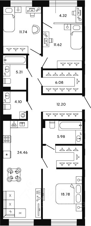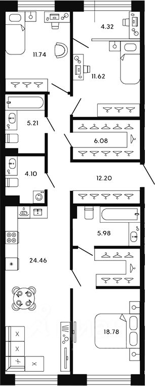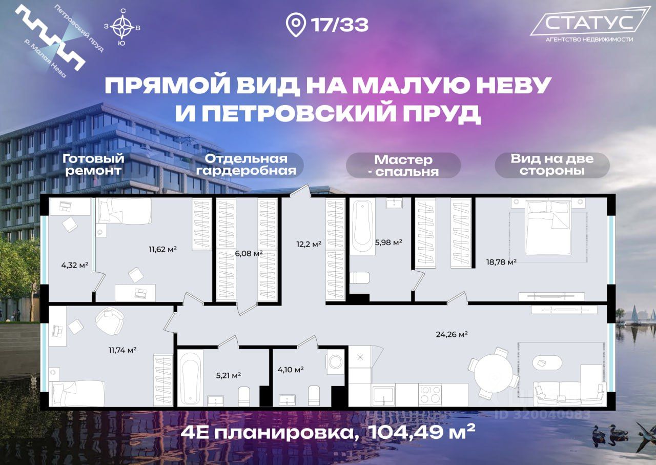 Об апартаментах: - видовые апартаменты общей площадью 104,49 кв. м, - чистовая отделка ''Светлый кашемир'', - 6 секция, LIFE, - 5 этаж, - двусторонняя эргономичная планировка: кухня-гостиная 24,46 кв. м, 3 просторные комнаты (в том числе мастер-спальня со своим санузлом и гардеробной), 3 санузла, 2 гардеробные, лоджия, - потолки 3 м, - панорамные окна, - прямой вид на Неву и Петровский пруд.