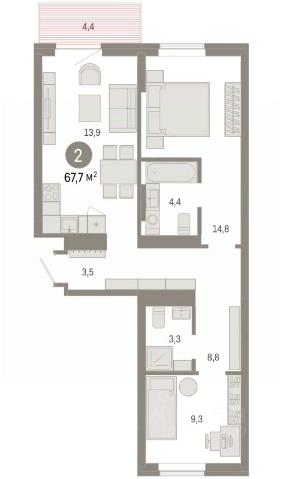 Квартира с кухней-гостиной и двумя спальнями в Кварталах Драверта. Особенности планировки: балкон, окна на две стороны, предчистовая отделка, разнесённые спальни. квартиры в нашей базе: ДВТ03-Ж8.5.5.