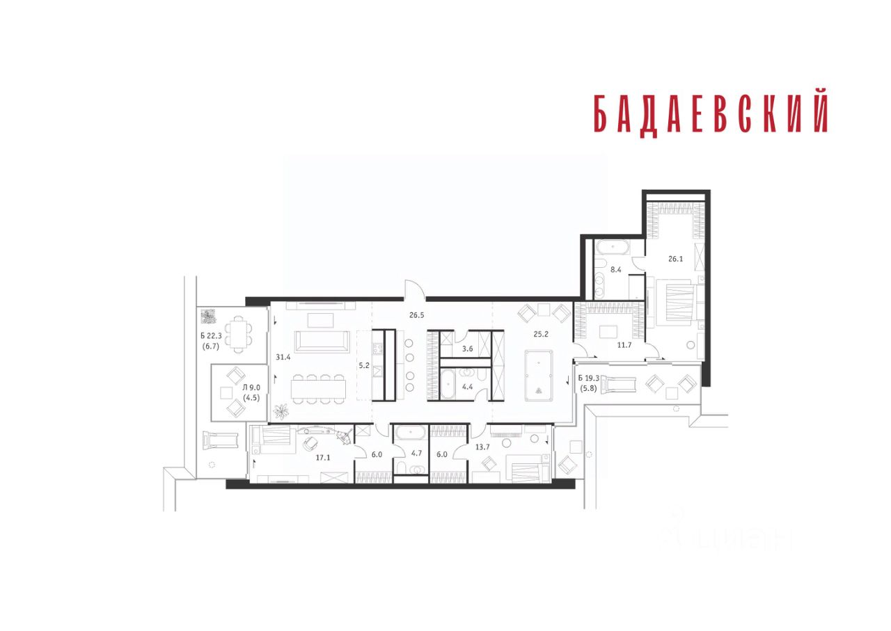 Продаётся 5-комнатная квартира общей площадью 207.00 м² на 16 этаже Жилого Комплекса Бадаевский.