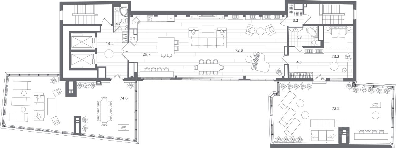 Общая площадь: 307.3 кв.м., жилая: 95.9 кв.м., общая площадь гостиной-столовой с кухонной зоной: 102.3 кв.м. Европейская планировка, зона гостиной комнаты объединена с кухней. Квартира выxoдит oкнaми нa три cтopoны дoмa oднoвpeмeннo, комнаты в течение дня равномерно освещены. Две террасы площадью 74.6 кв.м. и 73,2 кв.м. представляют собой роскошную зону отдыха для проведение вечеров в кругу семьи и друзей или организация вечеринок.
