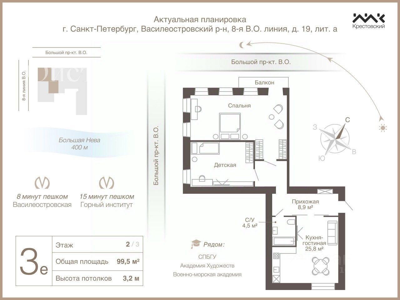 В пешей доступности находится набережная Лейтенанта Шмидта и Благовещенский мост. Рядом — Василеостровский рынок, Исаакиевский собор, Дворцовая площадь, Эрмитаж, рестораны, кафе, пекарни. В окружении — детские сады, школы, музеи, СПбГУ, Горный и Военно-морской университеты.