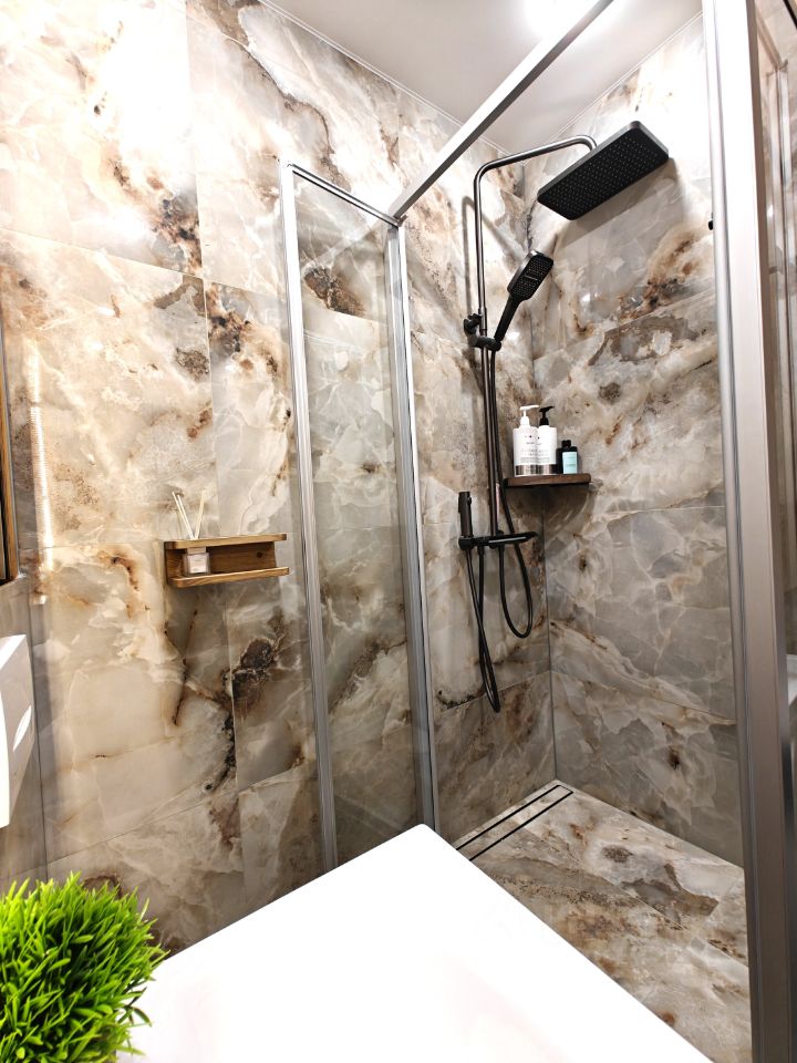 Технические ''плюшки'': теплый пол в санузле и на балконе, подогреваемый душевой поддон - регулируются дистанционно через вай-фай, продуманная разводка электрики (все розетки с usb-выходом и быстрой зарядкой).