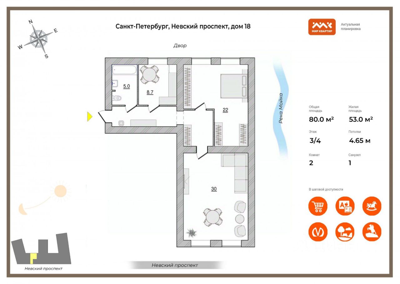 Эта видовая квартира обладает потрясающими характеристиками. Площадь 80 квадратных метров и потолки высотой в 4,65 метра создают ощущение великолепия и простора. Кроме того, двухсторонняя планировка позволяет наслаждаться видом на Невский проспект. Вы сможете любоваться красотой Санкт-Петербурга прямо из своего окна!