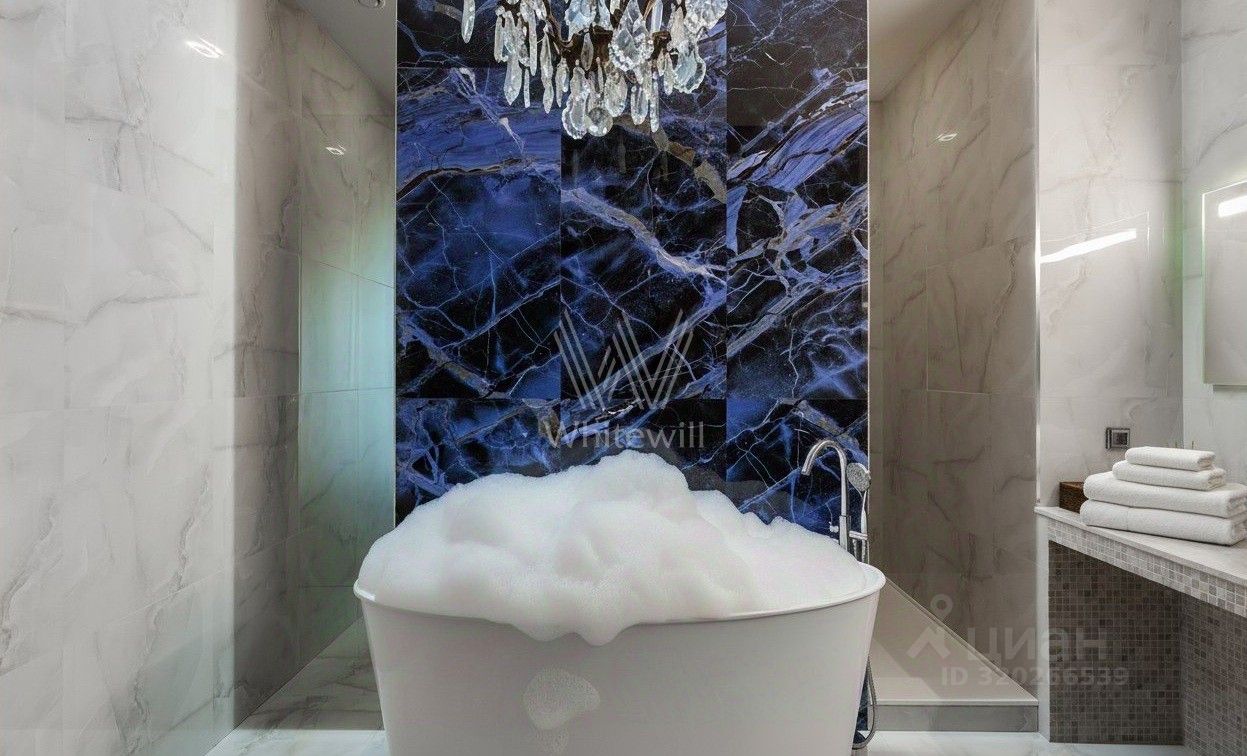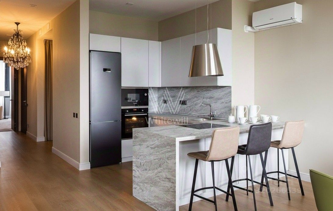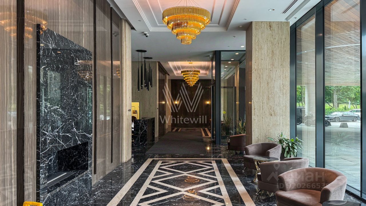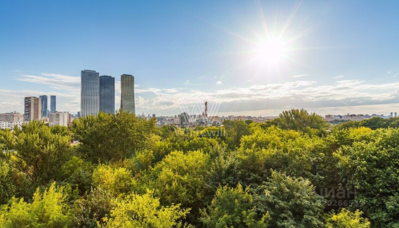 Квартира укомплектована мебелью и бытовой техникой. Функциональная планировка включает просторную кухню-гостиную с обеденной зоной, мастер-спальню со своей ванной комнатой, вторую спальню, три санузла, гардеробную и холл. Окна ориентированы на две стороны, открываются виды на природный заказник Долина реки Сетунь, башни ''Москва-Сити'', МГУ и на Парк Победы.