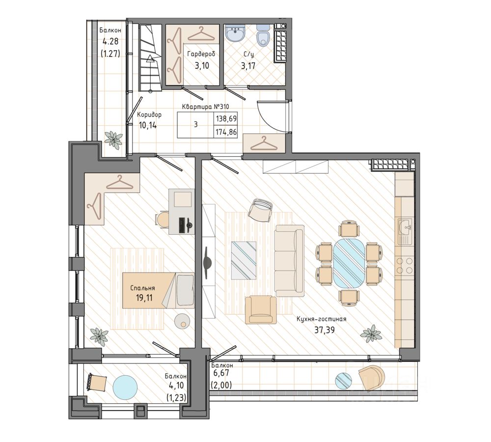 Двухуровневая квартира в новом ЖК ''Мануфактура James Beck'' с балконами и большой террасой площадью в 105 метров с видом на городе. Уникальное планировочное решение, создающее ощущение простора и воздушности, что особенно актуально для современных жизненных условий.