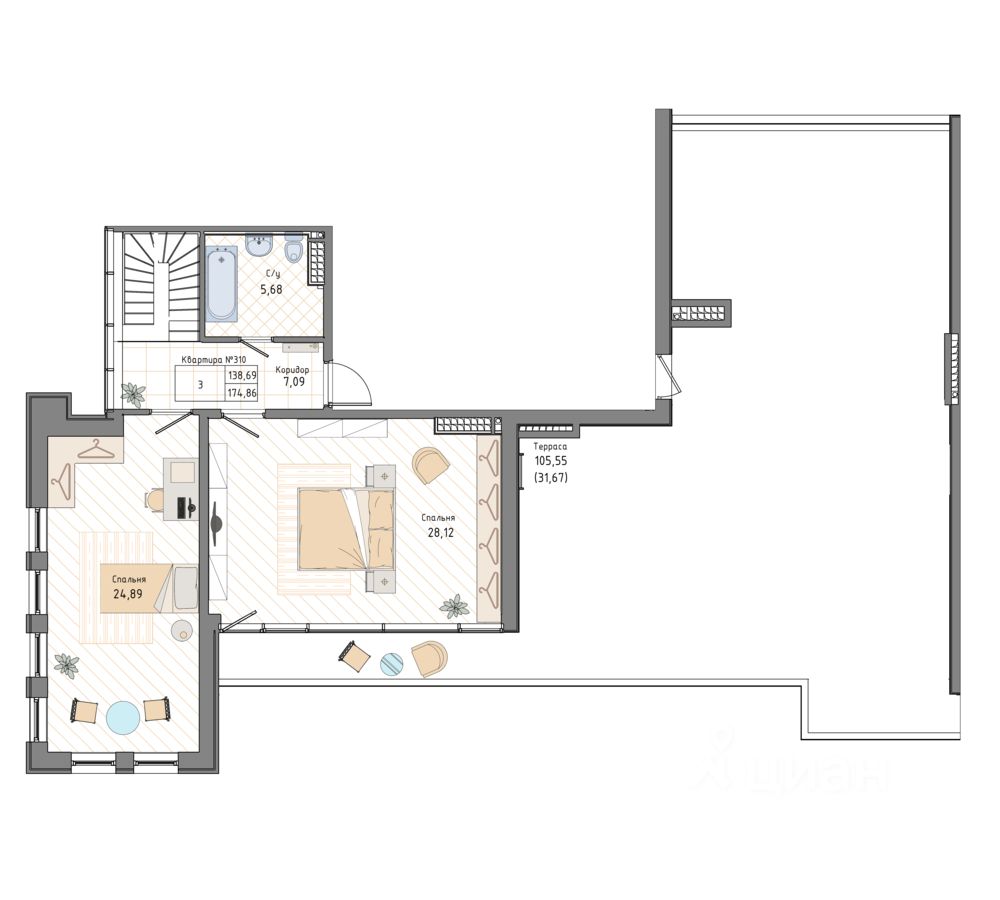 Что касается второго уровня, здесь случается настоящее волшебство! Огромная терраса площадью 105 квадратных метров — это не просто место для отдыха, это ваша персональная зона, где можно устраивать вечеринки или просто проводить время в уединении, наслаждаясь красивыми видами города.
