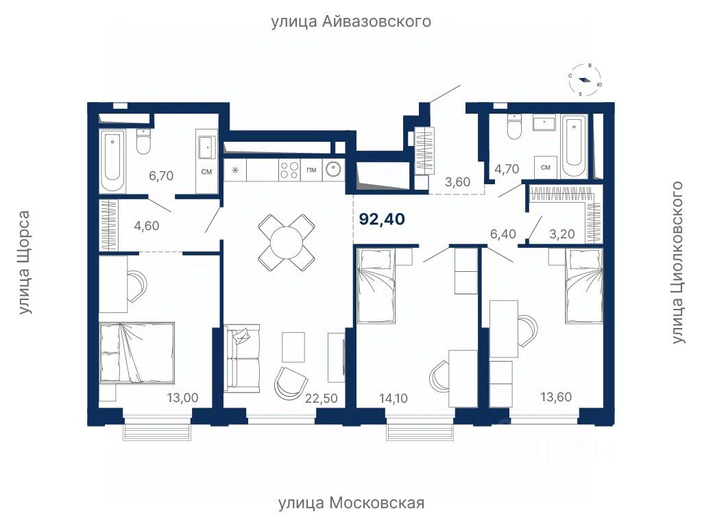 Локация — между ул. Московская, Щорса, Айвазовского и Циолковского, в шаговой доступности от метро Чкаловская.