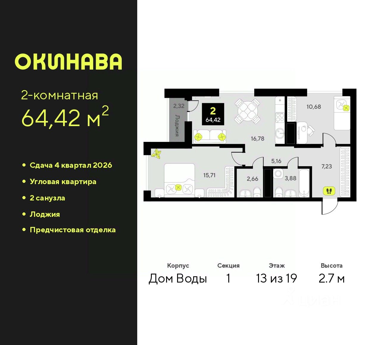 Продается двухкомнатная квартира с предчистовой отделкой в ЖК ''Окинава'' на 13 этаже. Общая площадь: 64.42 кв.м., жилая: 26.39 кв.м., площадь просторной кухни-столовой: 16.78 кв.м. Угловая квартира, идеально подойдет любителям тишины и панорамных видов. В квартире одна лоджия, один совмещенный и один раздельный санузел. Высота потолков 2.7 м.