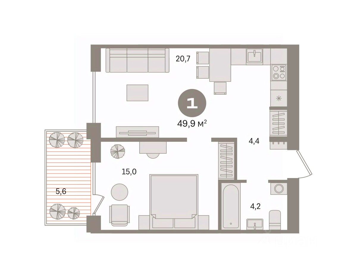 Квартира с кухней-гостиной и одной спальней в жилом районе ''Пшеница''. Особенности планировки: балкон, предчистовая отделка. квартиры в нашей базе: ПШЦ02.1-Ж4.5.5.