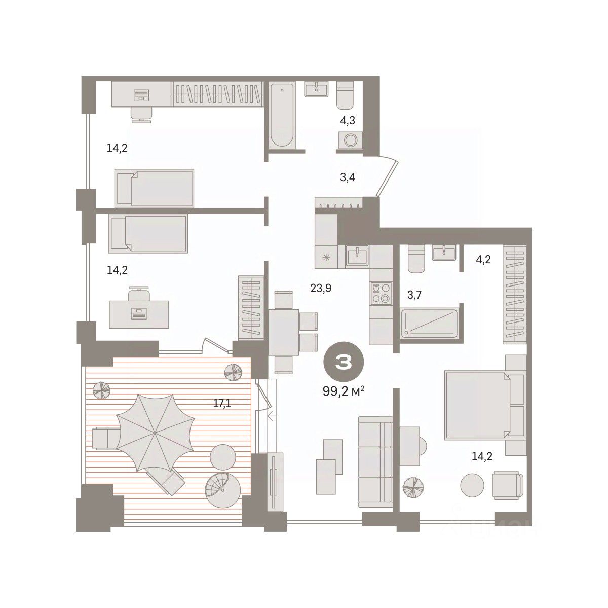 Квартира с кухней-гостиной и тремя спальнями в жилом районе ''Пшеница''. Особенности планировки: гардеробная, мастер-спальня, предчистовая отделка, разнесённые спальни, терраса на крыше. квартиры в нашей базе: ПШЦ02.1-Ж4.8.3.