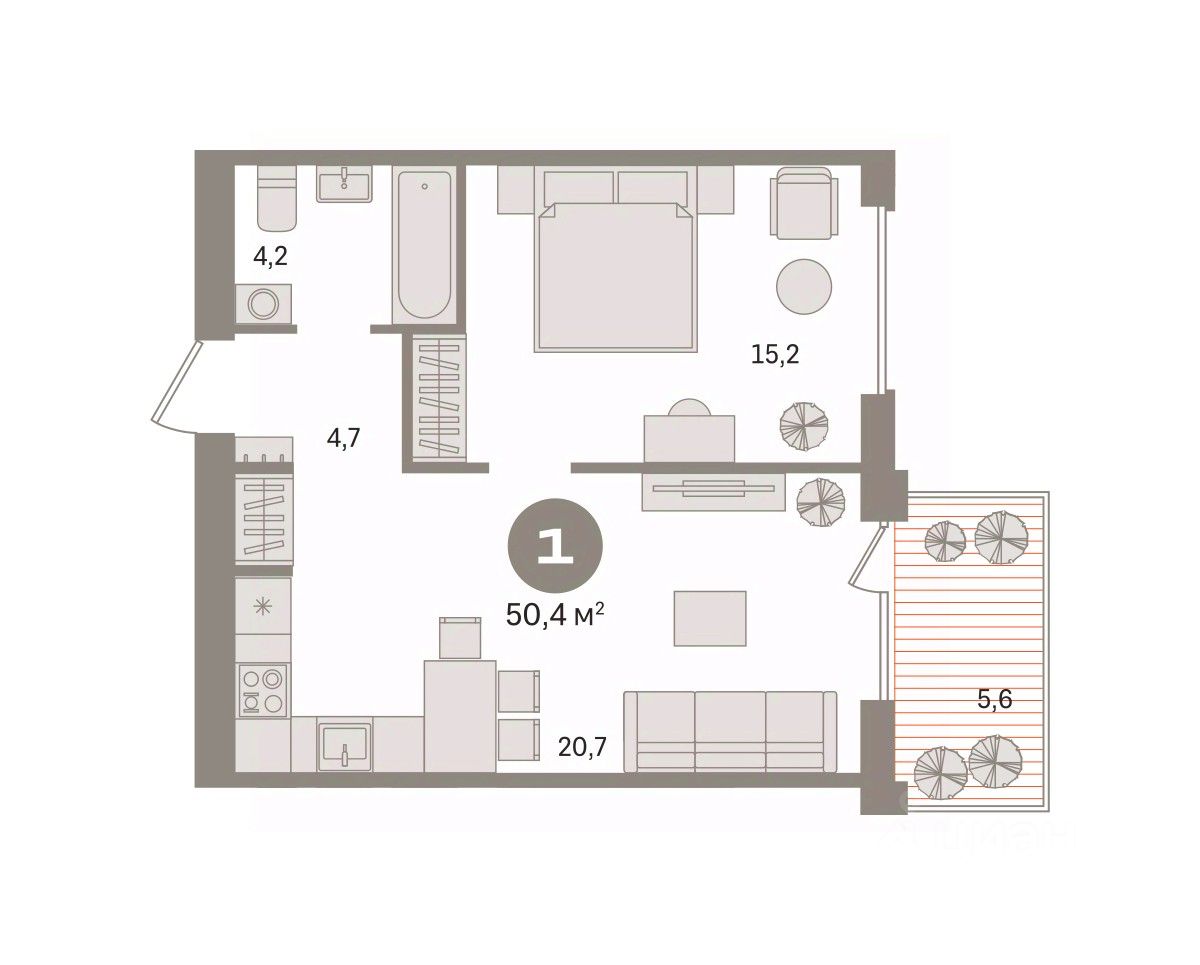 1-комн. квартира от застройщика с предчистовой отделкой в ЖК ''Пшеница'' на 5 этаже. Общая площадь: 50.38 кв.м., жилая: 15.2 кв.м., площадь просторной кухни-гостиной: 20.7 кв.м. Все окна выходят на одну сторону. В квартире один балкон, один совмещенный санузел. Высота потолков 2.7 м.