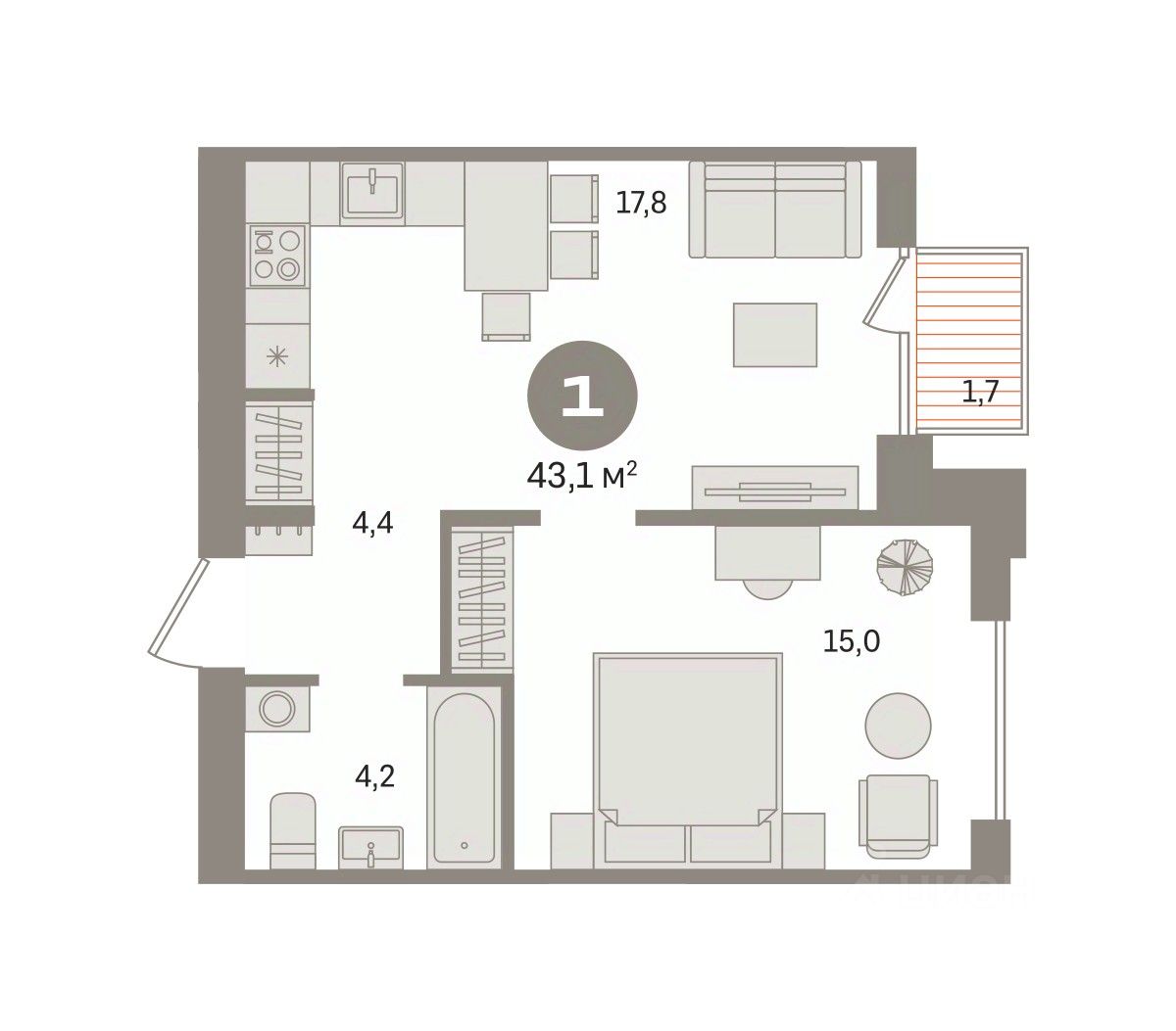 Продается 1-комн. квартира от застройщика с предчистовой отделкой в ЖК ''Пшеница'' на 3 этаже. Общая площадь: 43.07 кв.м., жилая: 15 кв.м., площадь просторной кухни-гостиной: 17.8 кв.м. Все окна выходят на одну сторону. В квартире один балкон, один совмещенный санузел. Высота потолков 2.7 м.
