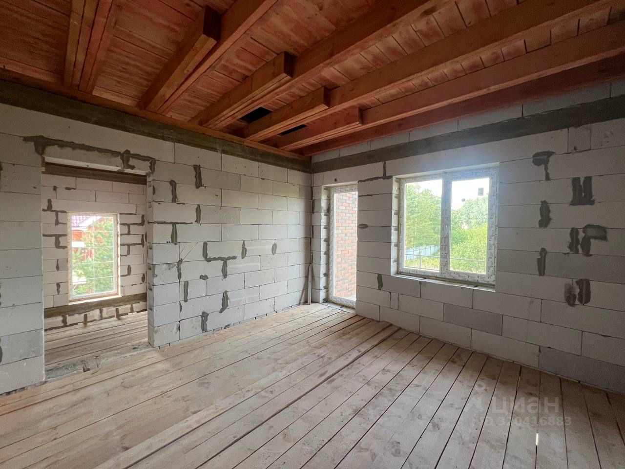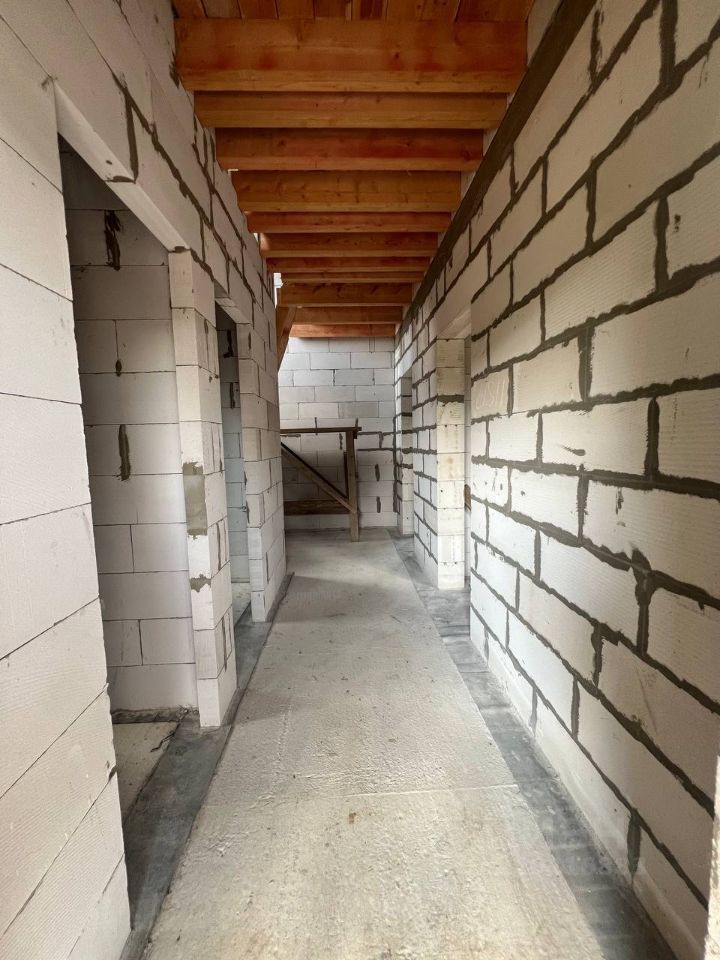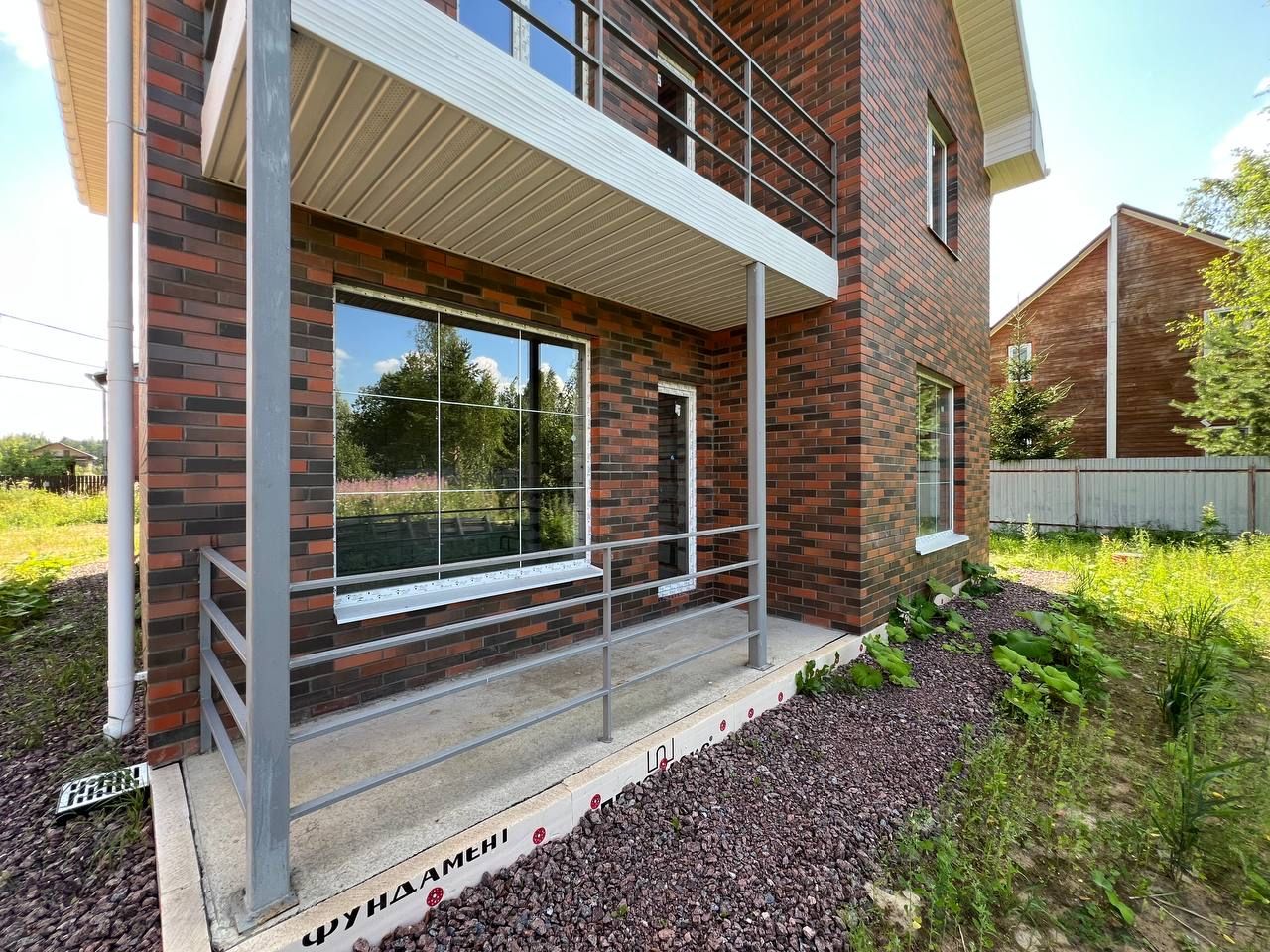 Фундамент: монолитная плита Материал стен: газобетон 300 мм с кирпичной облицовкой Крыша: металлочерепица