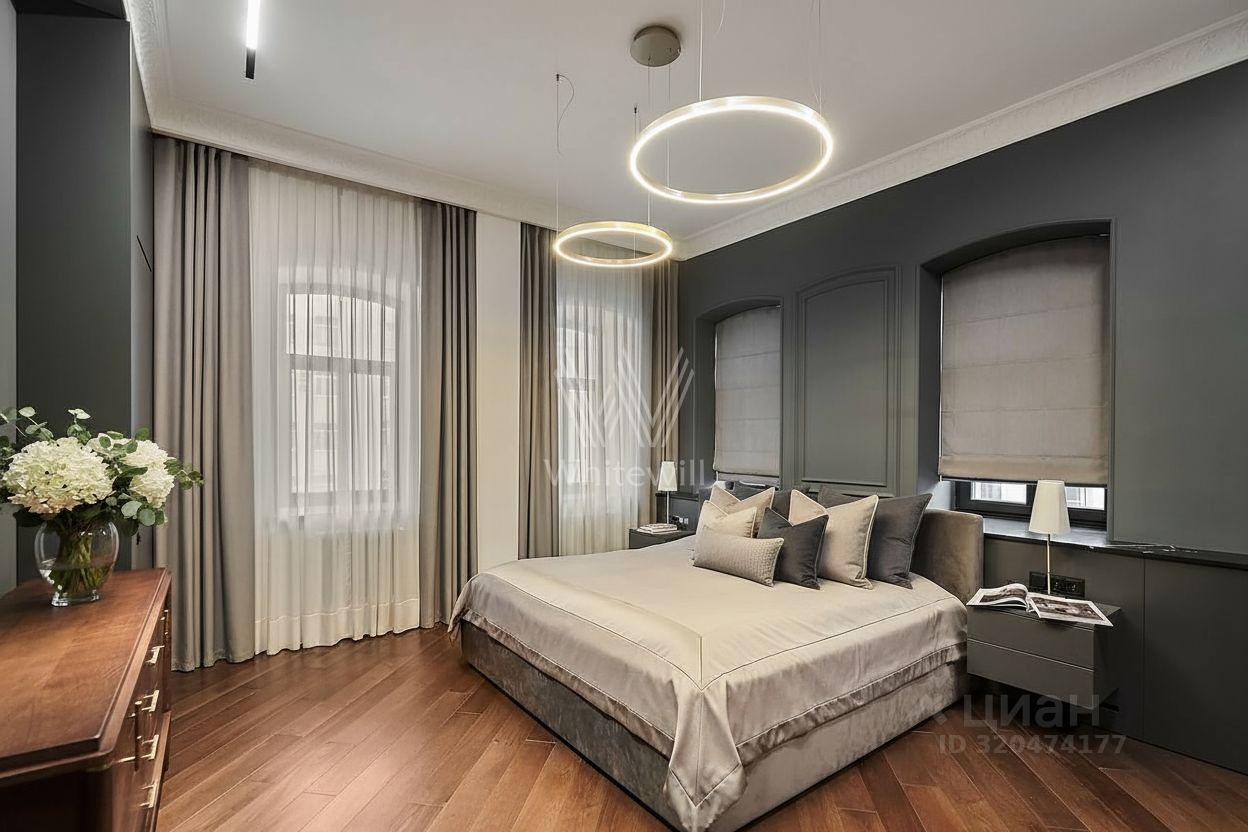 Апартаменты с двумя спальнями в клубном доме премиум-класса il Ricco на Чистых прудах. Апартаменты площадью 126 м² расположены на третьем этаже, выполнена дизайнерская отделка в современном стиле. Интерьеры наполнены мебелью и бытовой техникой. Спланирована кухня-гостиная, мастер-спальня с собственной ванной и гардеробной, вторая спальня, санузел, прихожая. Из окон открываются виды на две стороны света — на улицу и во двор.