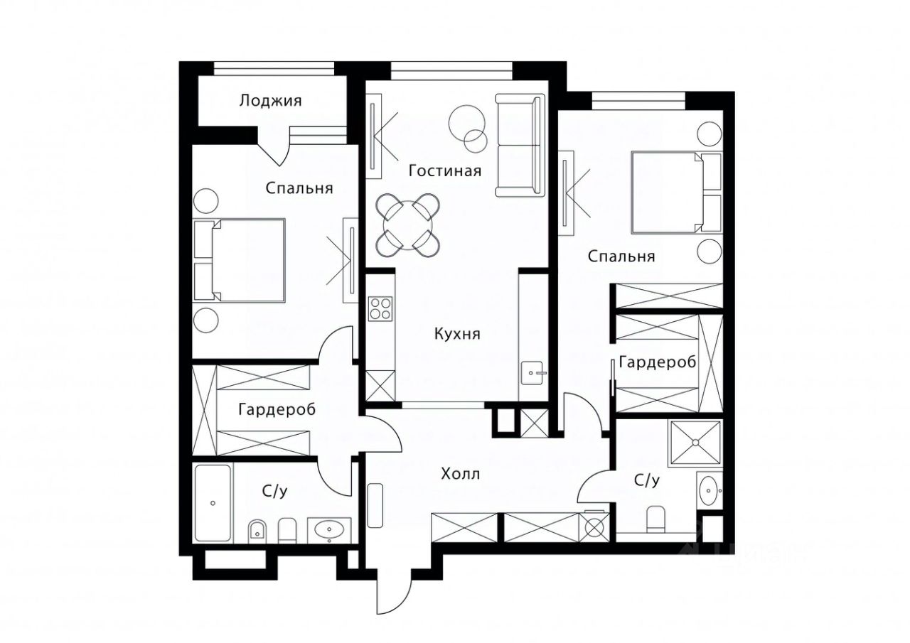 В квартире две изолированные спальни, светлая и уютная кухня-гостиная, два санузла, две гардеробные, у входа есть пространство для шкафов и постирочной. Стены ровные, оштукатурены, есть стяжка, установлена система кондиционирования, короба в санузлах, водоотведение, разводка по электрике. Потолки 3 метра.