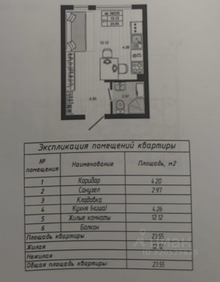 Жилая часть: 12.12 кв.м.+ кухня 4.26