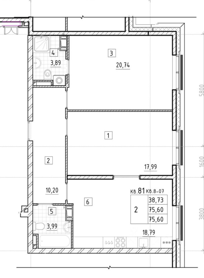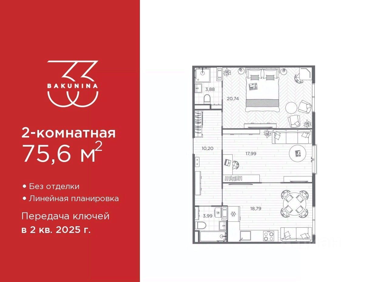 Продается видовая 2-х комнатная квартира в ЖК ''Бакунина 33''. Квартира расположена на 8 этаже 9 этажного дома, общая площадь: 75.6 кв.м., жилая: 38.73 кв.м., изолированные комнаты 20.74 кв.м., и 17.99 кв.м. площадь кухни-столовой: 18.79 кв.м., два просторных санузла 3.99 кв.м. и 3.89 кв.м. , квартира сдается без отделки.