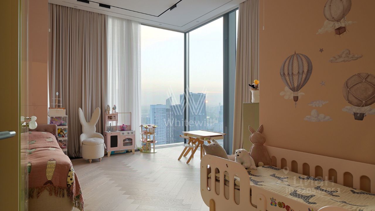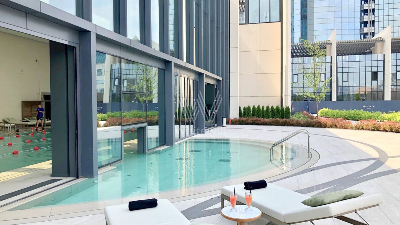 Видовые апартаменты с двумя спальнями общей площадью 160 м² в комплексе небоскрёбов премиум-класса Neva Towers. Угловой апартамент расположен на 37-м этаже в ''Башне 2''. Выполнена премиальная дизайнерская отделка, интерьер оформлен в современном стиле. Из панорамных окон открываются живописные виды на город на две стороны света. Планировка: угловая кухня-гостиная, мастер-спальня со своей ванной комнатой и гардеробной, спальня с угловым остеклением, ванная комната, холл. Апартамент полностью укомплектован мебелью и бытовой техникой. Одно машиноместо в подземном паркинге.