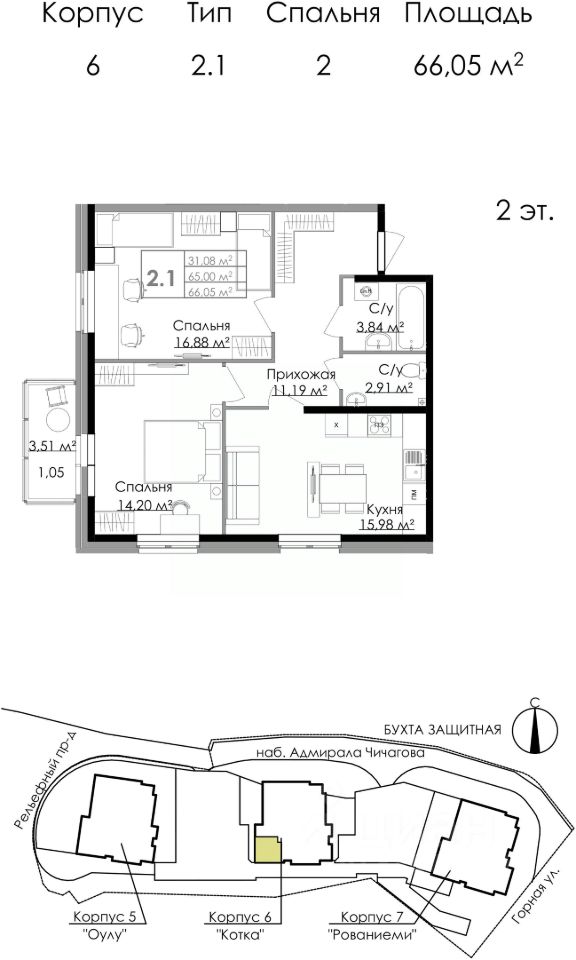 Продаётся 2-комнатная квартира в сданном доме (Дом М6 - Котка), срок сдачи: IV-кв. 2023, общей площадью 66.05 кв.м., на 2 этаже. ЖИЛОЙ КОМПЛЕКС В ВЫБОРГЕ
