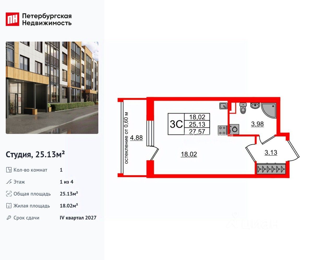 Удобная, классическая, функциональная европланировка, вместительная прихожая 3.13 м². Общая площадь студии - 25.13 м², жилая 18.02 м², высота потолка 2.77 м.