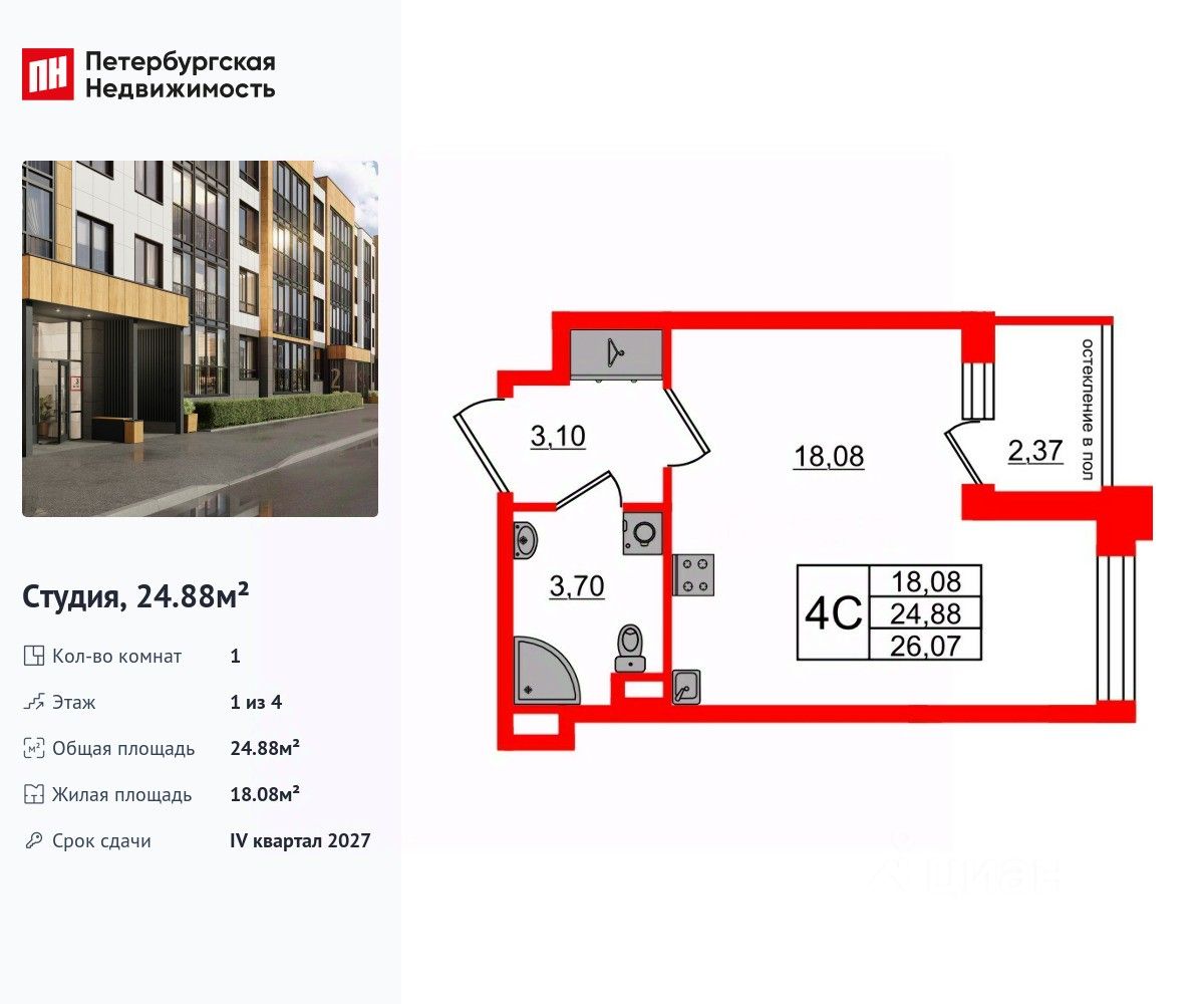 Удобная, классическая, функциональная европланировка, вместительная прихожая 3.1 м². Общая площадь студии - 24.88 м², жилая 18.08 м², высота потолка 2.77 м.