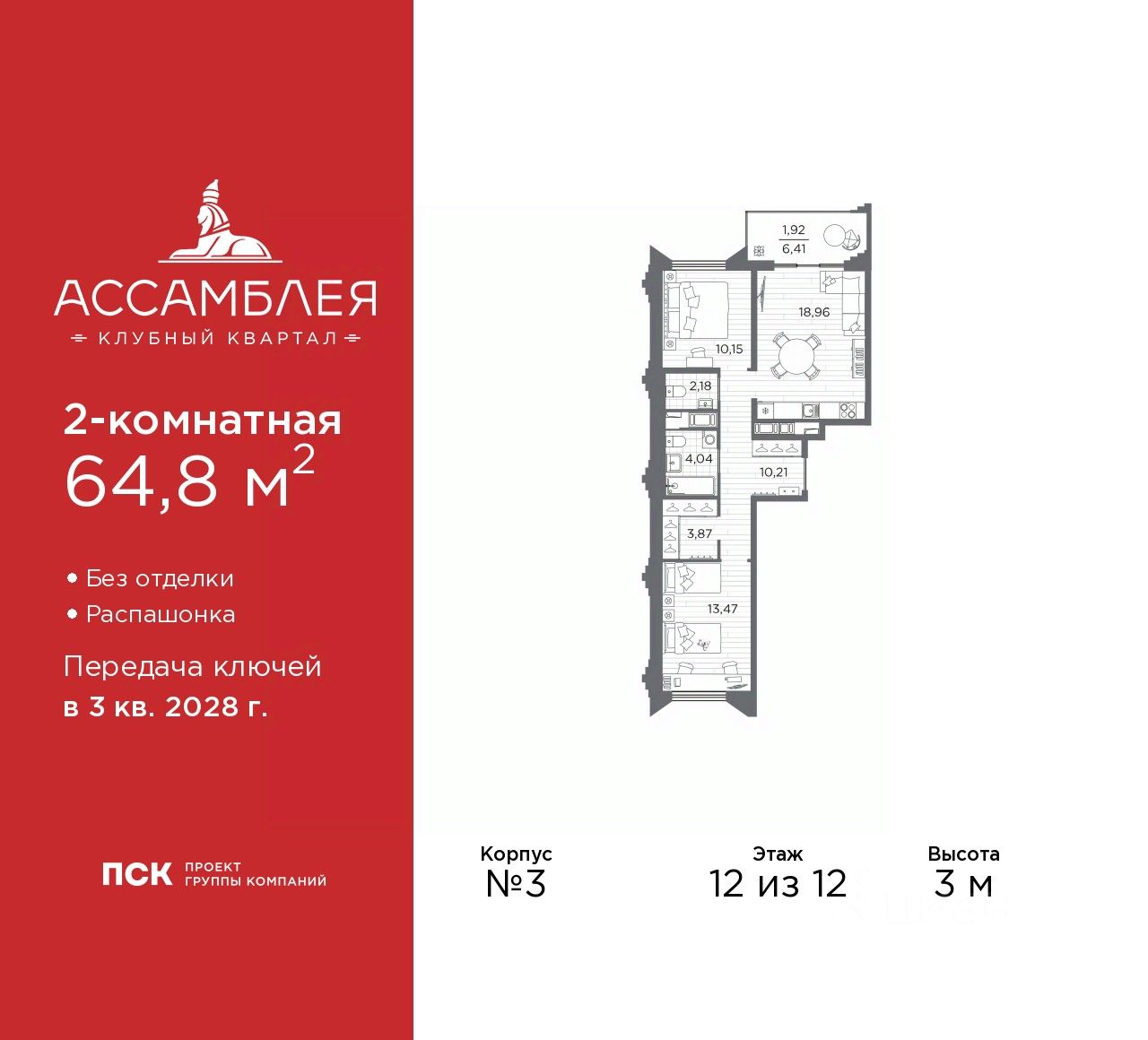 2-комн. квартира в Клубный квартал ''Ассамблея'' на 12 этаже. Квартира без отделки, полностью готова к чистовой отделке и дальнейшему ремонту. Общая площадь: 64.8 кв.м., жилая: 23.62 кв.м., площадь просторной кухни-столовой: 19.96 кв.м. Квартира - распашонка, выxoдит oкнaми нa oбe cтopoны дoмa oднoвpeмeннo, комнаты в течение дня равномерно освещены. В квартире один балкон, один совмещенный и один раздельный санузел. Высота потолков 3 м.