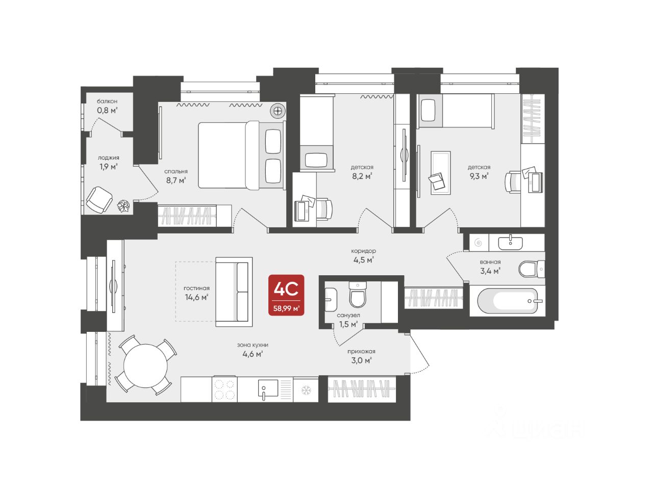 Общая площадь58,99 м2