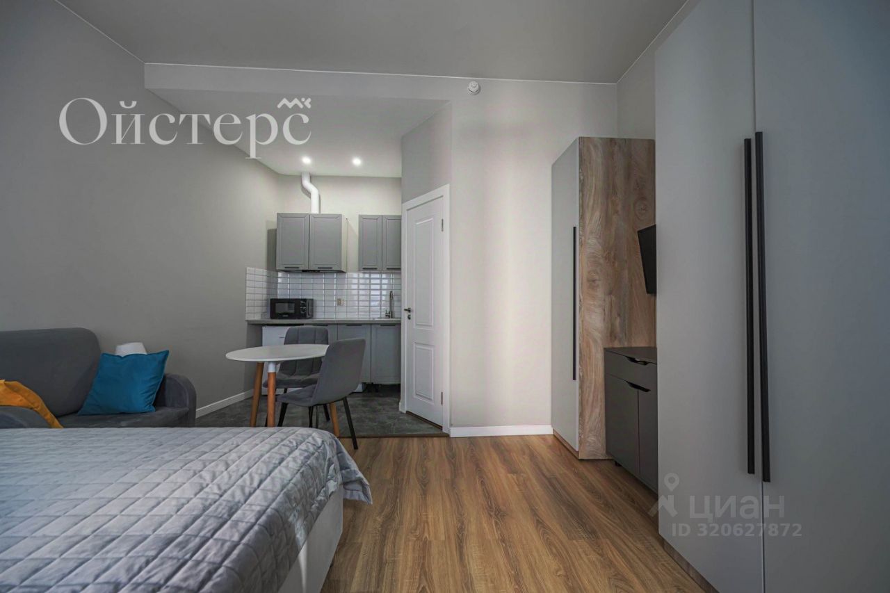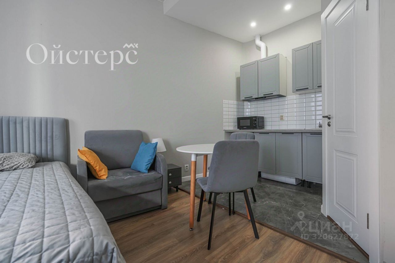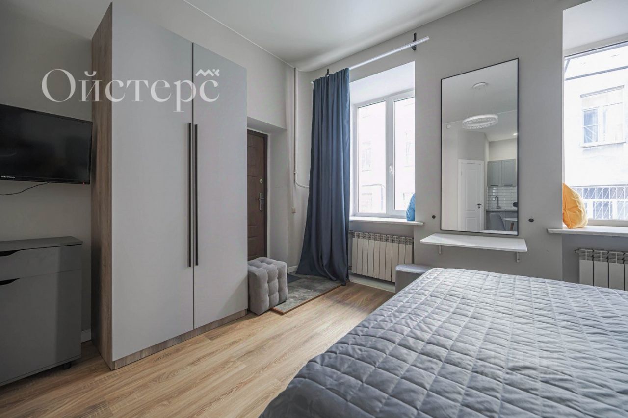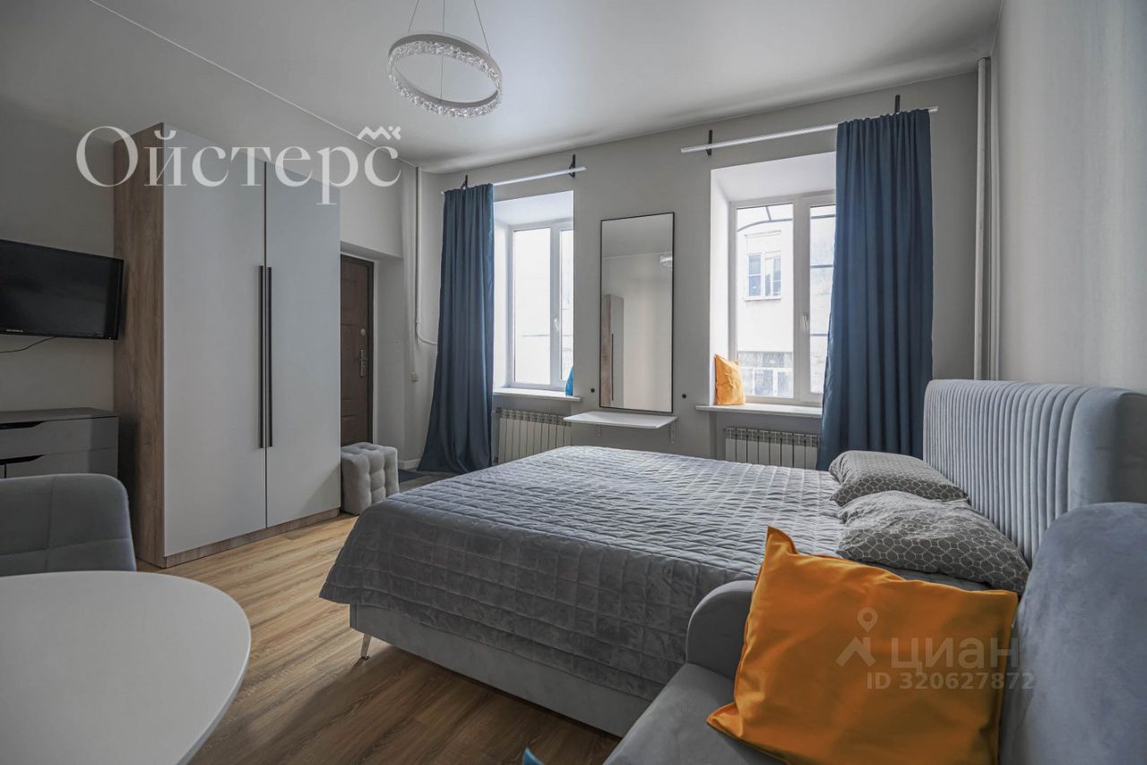Общая площадь студии — 22.7 м², из которых 18 м² занимает жилое пространство. Выполнен качественный евроремонт, а высота потолков 3 метра добавляет пространству воздуха и свободы. Вся необходимая мебель, техника и оснащение остаются новому владельцу. Во дворе есть парковка.