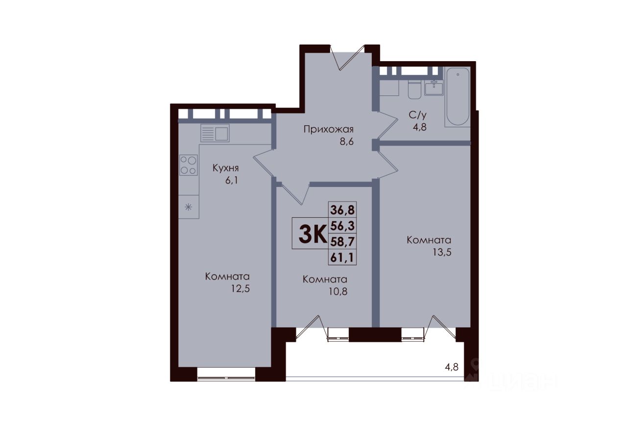 Общая площадь58,7 м2