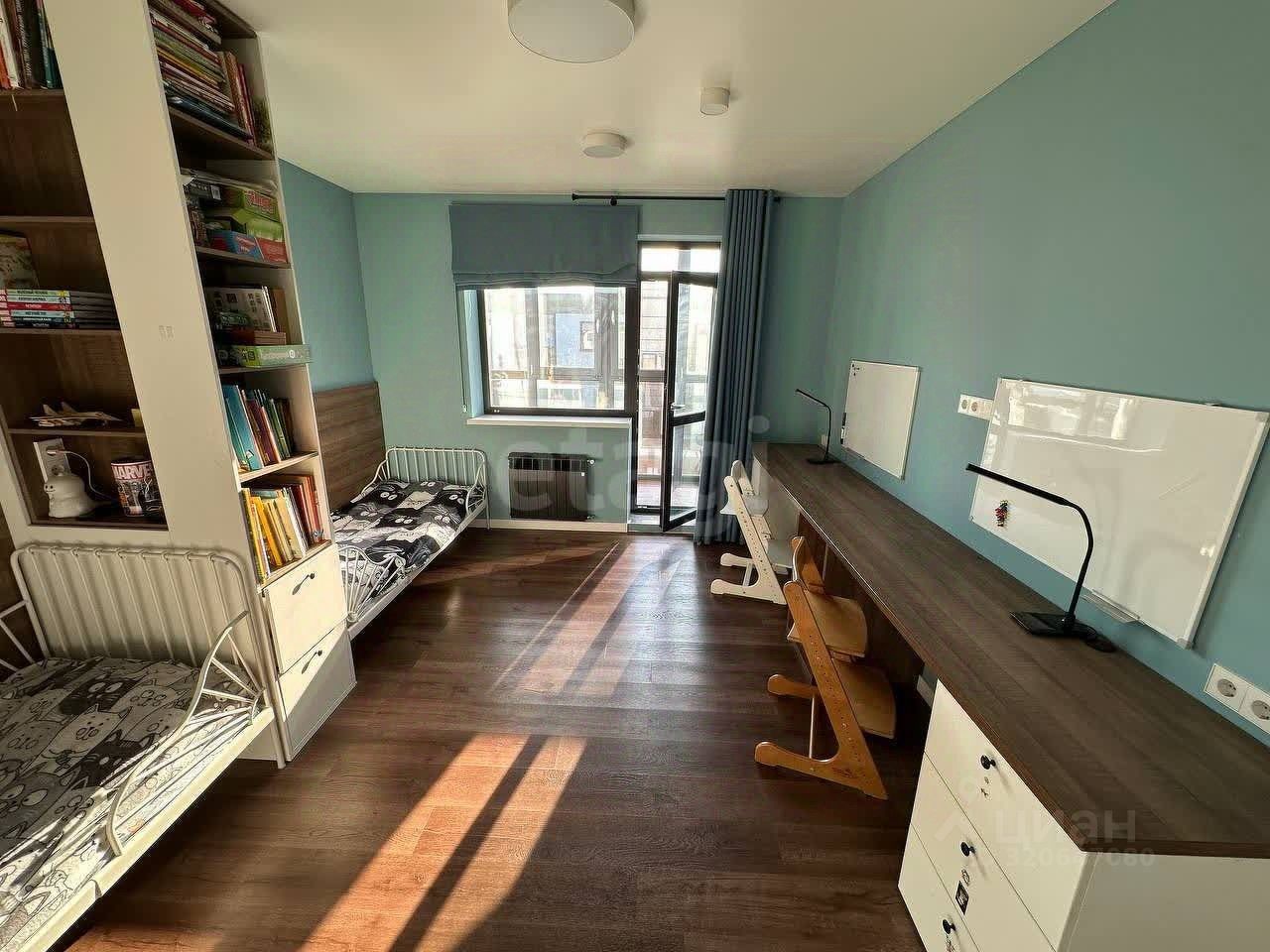 Качественный дизайнерский ремонт, окна выходят на улицу.Квартира полностью мебелерованная, остается вся встроенная мебель: кухня, большой шкаф в прихожей, мебель детской: шкафы, стеллажи, рабочие места, мебель в санузлах, а также шкаф в спальне.