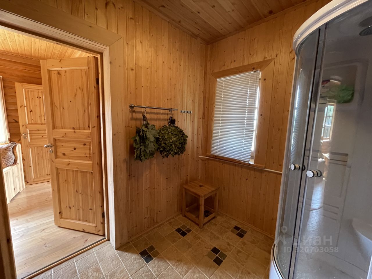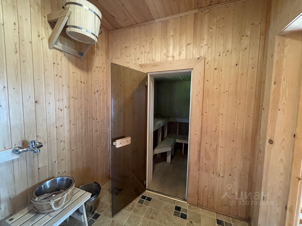Баня 2007г, общая площадь 41,4м2. На 1-ом этаже расположены: гостиная, душевая, парная, санузел и тамбур. Мансарда обустроена под жилую комнату, имеет отдельный вход с крыльца. На улице перед баней оборудована ванна.