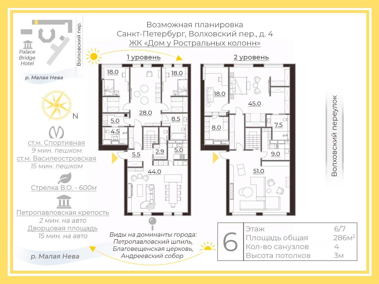 Арт. 112132508 Продаётся уникальная двухуровневая квартира в самом центре Петербурга — Волховский, 4 Общая площадь: 286 м² Этажи: 6 и 7 (последние) Потолки: 3 метра Статус: квартира (жилое помещение) Собственник: 1 физическое лицо, прямая продажа Состояние:Без ремонта — идеальный вариант для индивидуального дизайн-проекта.Планировка и окна: Свободная планировка, без несущих стен Двусторонняя ориентация Увеличенные окна на верхнем уровне Особенности:Два уровня Последние этажи Панорамные виды Дом в историческом районе Уникальная возможность реализовать интерьер в знаковом месте города Дом:Круглосуточная охрана Система видеонаблюдения Система контроля доступа Закрытая территория Подземный паркинг Инфраструктура и окружение:Дом расположен на Волховском переулке, в непосредственной близости от Ростральных колонн, Стрелки Васильевского острова, Дворцового моста и Зимнего дворца. Развитая инфраструктура: музеи, рестораны, университеты, общественный транспорт — всё в шаговой доступности.