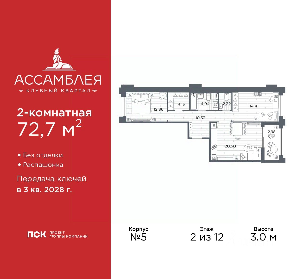 Просторная 2-комн. квартира в Клубный квартал ''Ассамблея'' на 2 этаже. Квартира без отделки, полностью готова к чистовой отделке и дальнейшему ремонту. Общая площадь: 72.7 кв.м., жилая: 27.27 кв.м., площадь просторной кухни-столовой: 20.5 кв.м. Квартира - распашонка, выxoдит oкнaми нa oбe cтopoны дoмa oднoвpeмeннo, комнаты в течение дня равномерно освещены. В квартире одна лоджия, один совмещенный и один раздельный санузел. Высота потолков 3.0 м.