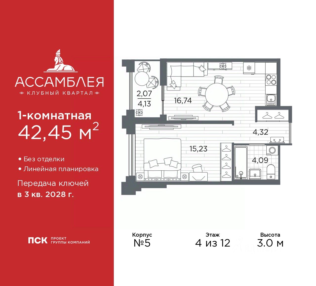 Продается 1-комн. квартира в Клубный квартал ''Ассамблея'' на 4 этаже. Квартира без отделки, полностью готова к чистовой отделке и дальнейшему ремонту. Общая площадь: 42.45 кв.м., жилая: 15.23 кв.м., площадь просторной кухни-столовой: 16.74 кв.м. Все окна выходят на одну сторону. В квартире одна лоджия, один совмещенный санузел. Высота потолков 3.0 м.