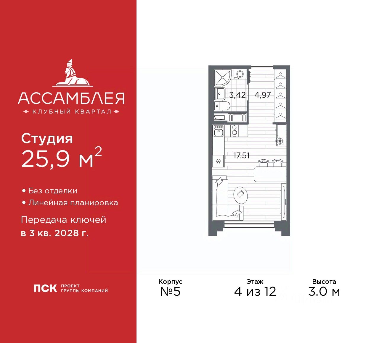 Просторная 1-комн. квартира-студия в Клубный квартал ''Ассамблея'' на 4 этаже. Квартира без отделки, после выдачи ключей можно делать ремонт. Общая площадь: 25.9 кв.м., площадь гостиной 17.51 кв.м., из которых 5 кв.м. выделено под кухонную зону. Все окна выходят на одну сторону. В квартире один совмещенный санузел. Высота потолков 3.0 м.