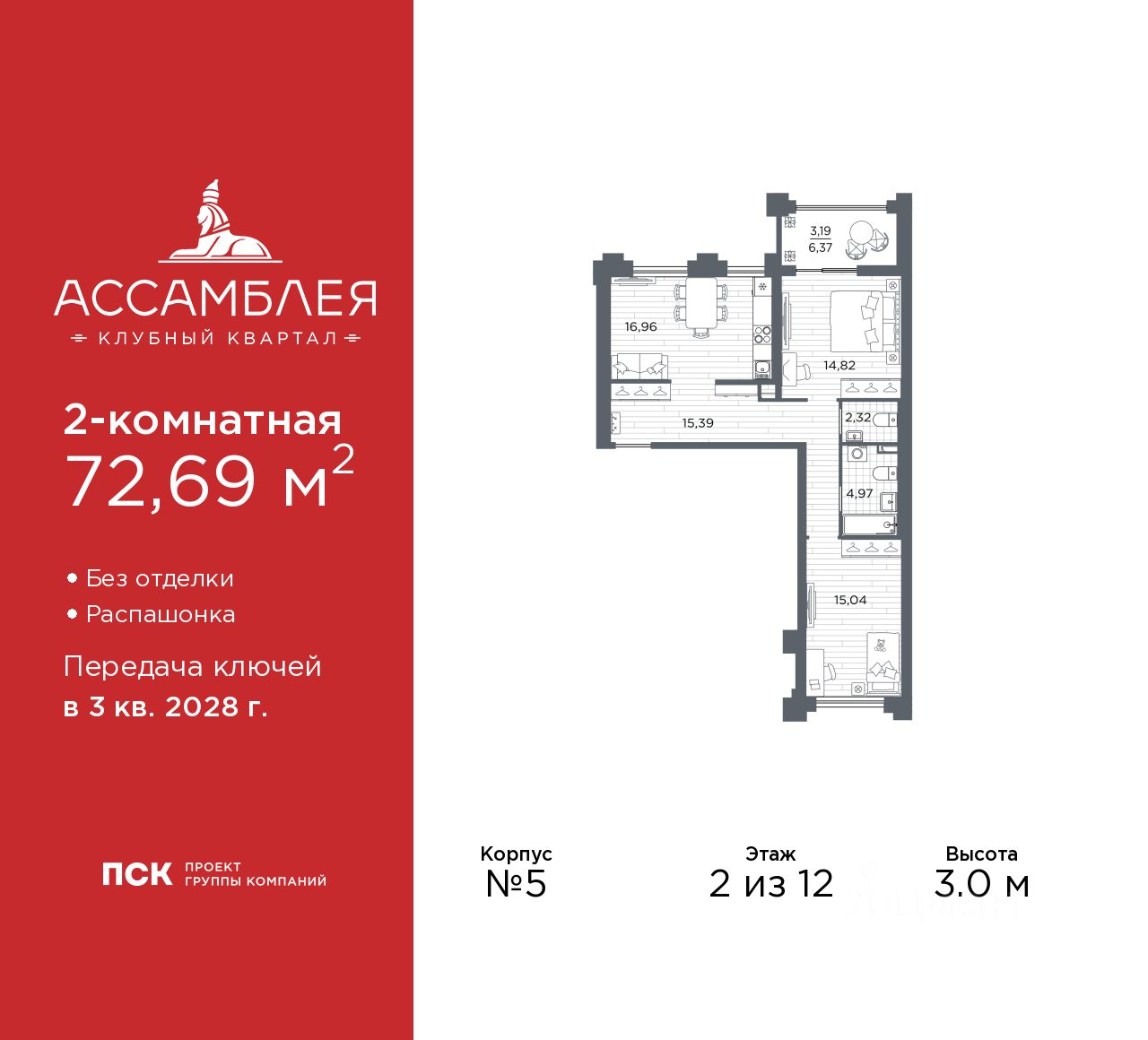 2-комн. квартира в Клубный квартал ''Ассамблея'' на 2 этаже. Квартира без отделки, новый владелец может сделать ремонт по индивидуальному дизайн-проекту. Общая площадь: 72.69 кв.м., жилая: 29.86 кв.м., площадь просторной кухни-столовой: 16.96 кв.м. Квартира - распашонка, без проходных комнат, окна выходят на paзные стороны дома. В квартире один балкон, один совмещенный и один раздельный санузел. Высота потолков 3.0 м.