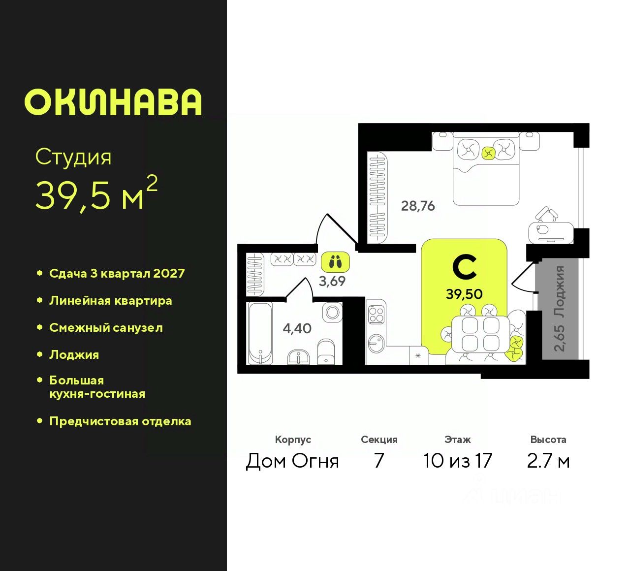 Продается однокомнатная квартира-студия с предчистовой отделкой в ЖК ''Окинава'' на 10 этаже. Общая площадь: 39.5 кв.м., площадь гостиной 28.76 кв.м., из которых 5 кв.м. выделено под кухонную зону. Все окна выходят на одну сторону. В квартире одна лоджия, один совмещенный санузел. Высота потолков 2.7 м.