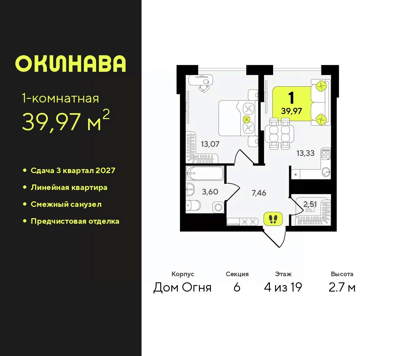 Однокомнатная квартира от застройщика с предчистовой отделкой в ЖК ''Окинава'' на 4 этаже. Общая площадь: 39.97 кв.м., жилая: 13.07 кв.м., площадь просторной кухни-столовой: 13.33 кв.м. Все окна выходят на одну сторону. В квартире один совмещенный санузел. Высота потолков 2.7 м.