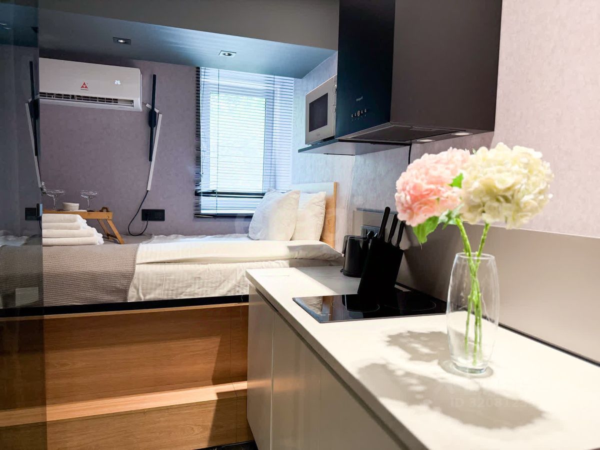 Стильные и уютные апартаменты площадью 9,9 квадратных метров созданы с учетом всех современных требований. Внутри вы найдете все необходимое для комфортного проживания: душевую кабину, спальное место, варочную поверхность, микроволновую печь, стиральную машину, холодильник, сплит-систему, фен и телевизор.
