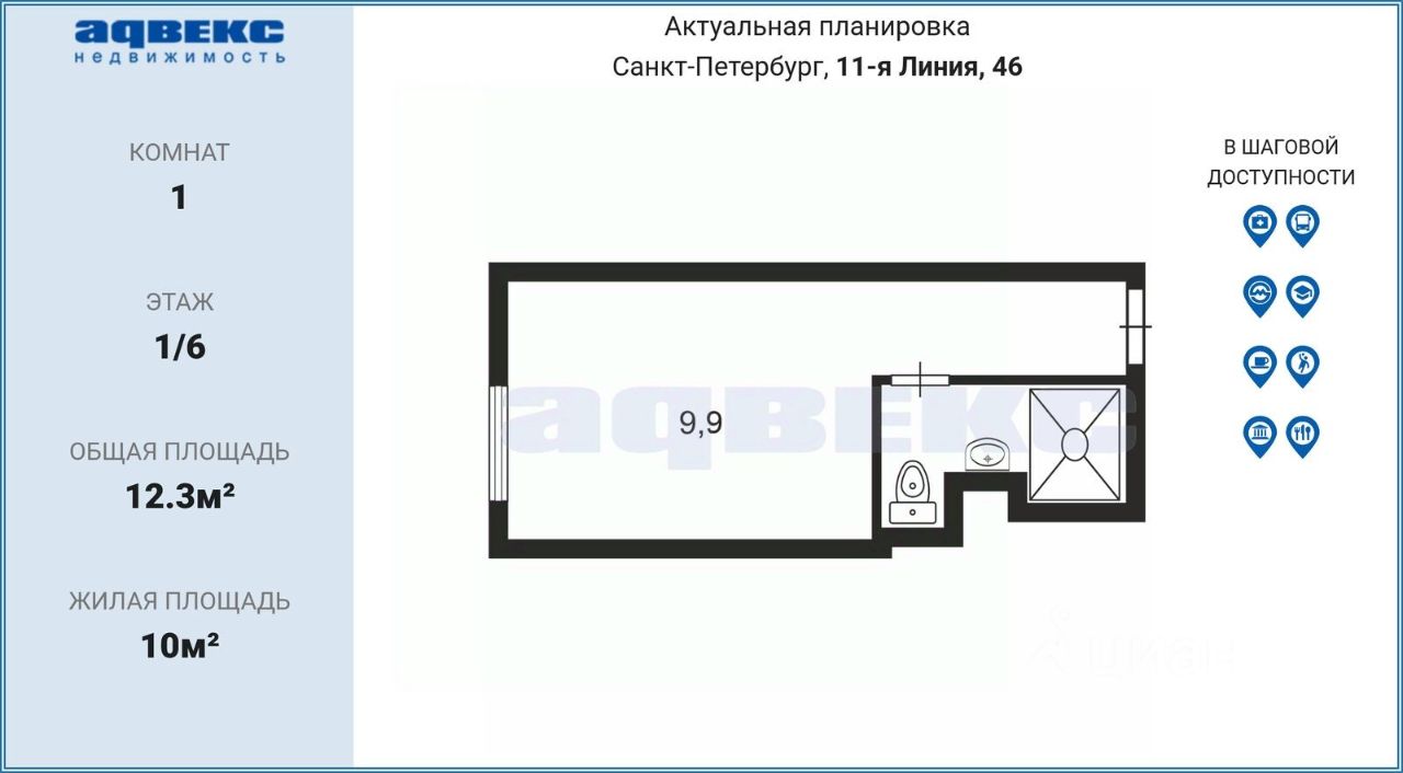 ОБЪЕКТ: • Первый этаж кирпичного шестиэтажного дома • Компактные 12,3 м. с продуманной планировкой: - Уютная жилая зона 10,0 м. - Аккуратный санузел 2,3 м.