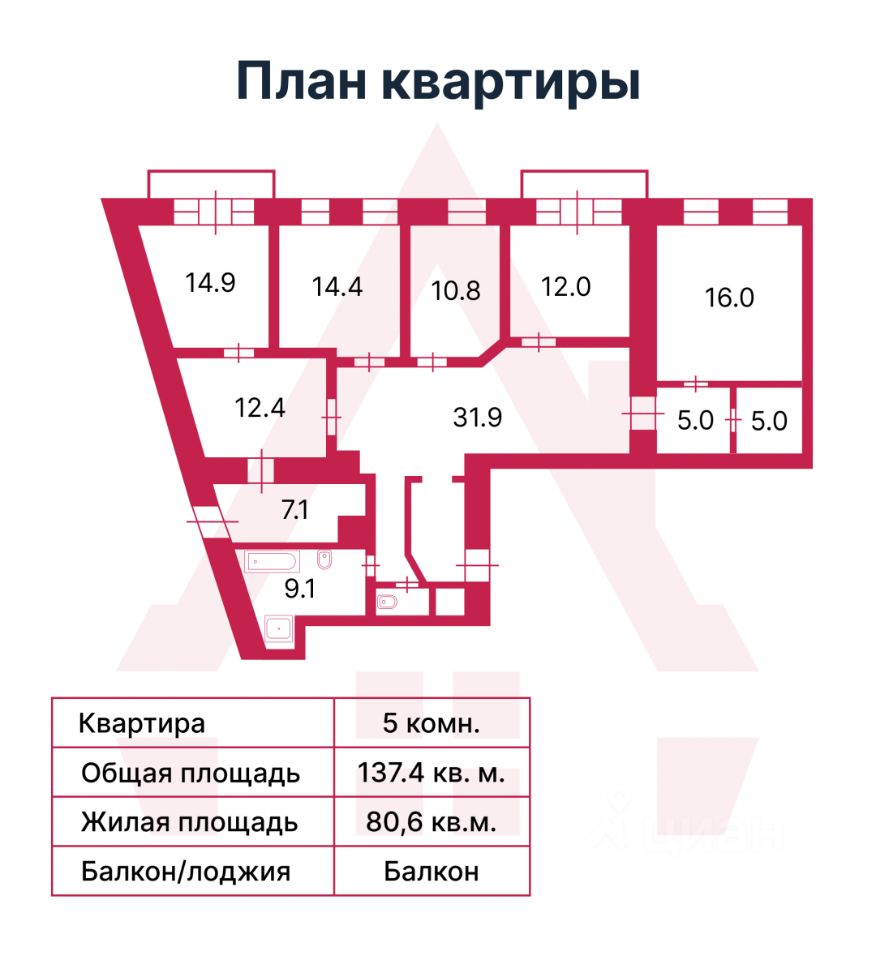 Квартира расположена на пятом этаже шестиэтажного жилого здания начала XX века — классического образца архитектуры стиля модерн, построенного ещё в далёком 1914 году. Общая площадь предлагаемой квартиры составляет 137.3 квадратных метра.