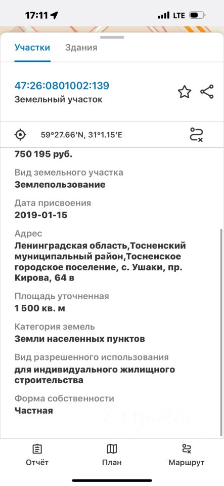 Срочная продажа! Цена самая низкая по рынку В прямой продаже отличный земельный участок 1500 кв. м. (15 соток), расположенный по адресу Лен обл., Тосненский р-н, с. Ушаки, пр. Кирова, 64В Кадастровый номер 47:26:0801002:139 Возможен самостоятельный просмотр участка в любое удобное для вас время (напишите мне - расскажу как доехать до участка) или со мной по договоренности. Координаты местонахождения участка для навигатора: 59.461245, 31.019341 Копируете, вставляете в поисковую строку Яндекс навигатора и вы на месте. Категория земель: земли населенных пунктов Вид разрешённого использования: для индивидуального жилищного строительства (ИЖС) Это значит, что МОЖНО ПОСТРОИТЬ ДОМ И ПРОПИСАТЬСЯ В НЁМ Участок ровный, высокий и прямоугольный. Дорога идет до самого участка. Электричество 15кВт (столб рядом). Газ по границе участка. Хорошая транспортная доступность - до Тосно 10 мин, до КАД примерно час По документам: один собственник, прямая продажа, межевание сделано (можете посмотреть на публичной кадастровой карте) Без арестов, долгов и без обременений Как купить : за наличные, в ипотеку (даже без первого взноса, помогу с одобрением), земельный сертификат и др. Инфраструктура: В Ушаках в шаговой доступности остановка автобуса, ж/д станция, Магнит, церковь, ПВЗ Вб и озон, гостиница, парк.Рядом город Тосно, где есть всё для комфортного проживания: вокзалы, ТЦ, фитнес зал, бассейн, школы, детские сады, поликлиника, больница, МФЦ, парк, детские площадки, прогулочные зоны, магазины, спортивные объекты, кинотеатр, скейтпарк, отделения банков, библиотека, творческие центры, ДК и др. По любым вопросам звоните или пишите
