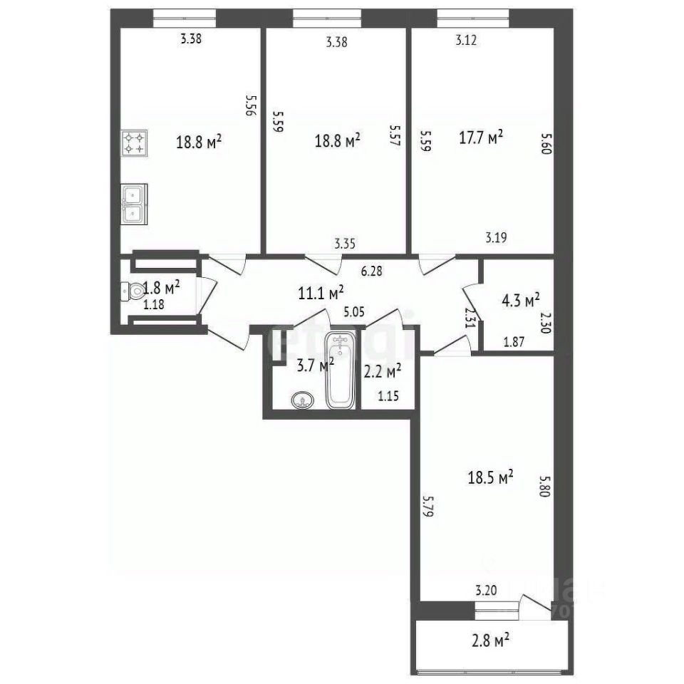 Комнаты 18.8 кВ м 17.7 кВ м 18.5 кВ м Кухня 18.8 кВ м Коридор 11.1 кВ м Гардеробная с сушильной машиной 4.3 кВ м Ванная комната с туалетом 5.9 кВ м Туалет 1.8 кВ м Балкон 2.8 кВ м