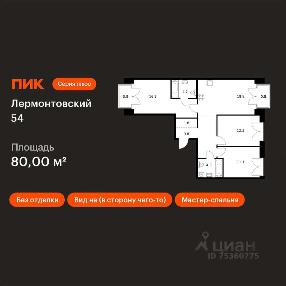 Продаётся 3-комн. квартира площадью 80 кв.м на 7 этаже 9 этажного дома (Корпус 2.2, Секция 12) проекта ПИК Лермонтовский 54. Светлый просторный подъезд на уровне земли, функциональная планировка, большие окна, без отделки.
